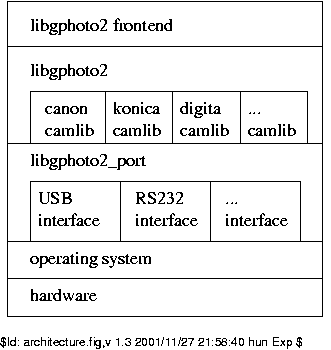 It abstracts communication ports and camera protocol, to allow a complete modularity. To support a new communication physical layer (like IEEE1394), just add a new port to libgphoto2_port. To support a new kind a digital camera, just provide a new camlib with the required callbacks. All of this will be transparent to client (programs that call libgphoto2 For a deeper view of the inner working of libgphoto2, please read the apropriate chapter in the gPhoto2 manual |